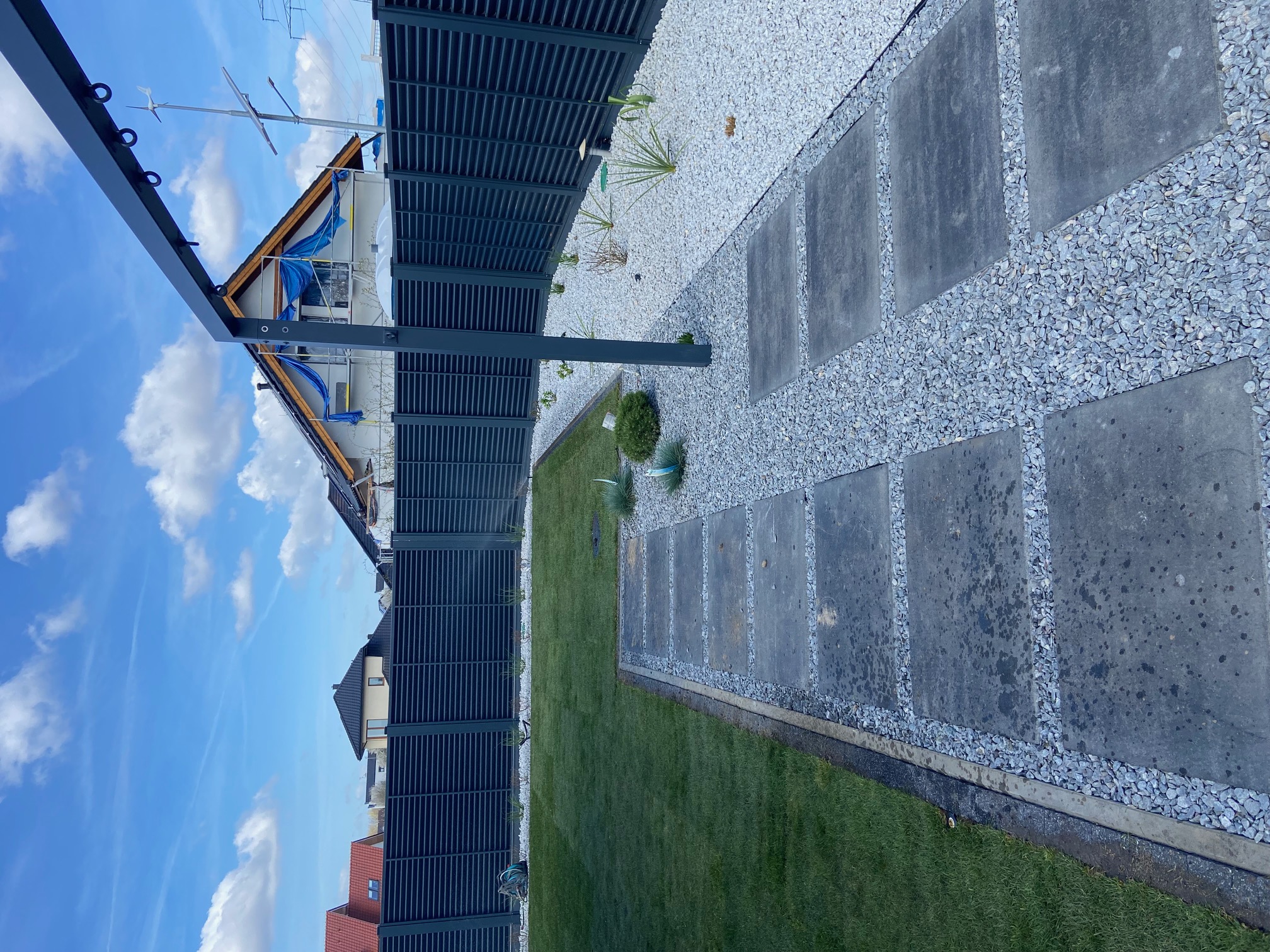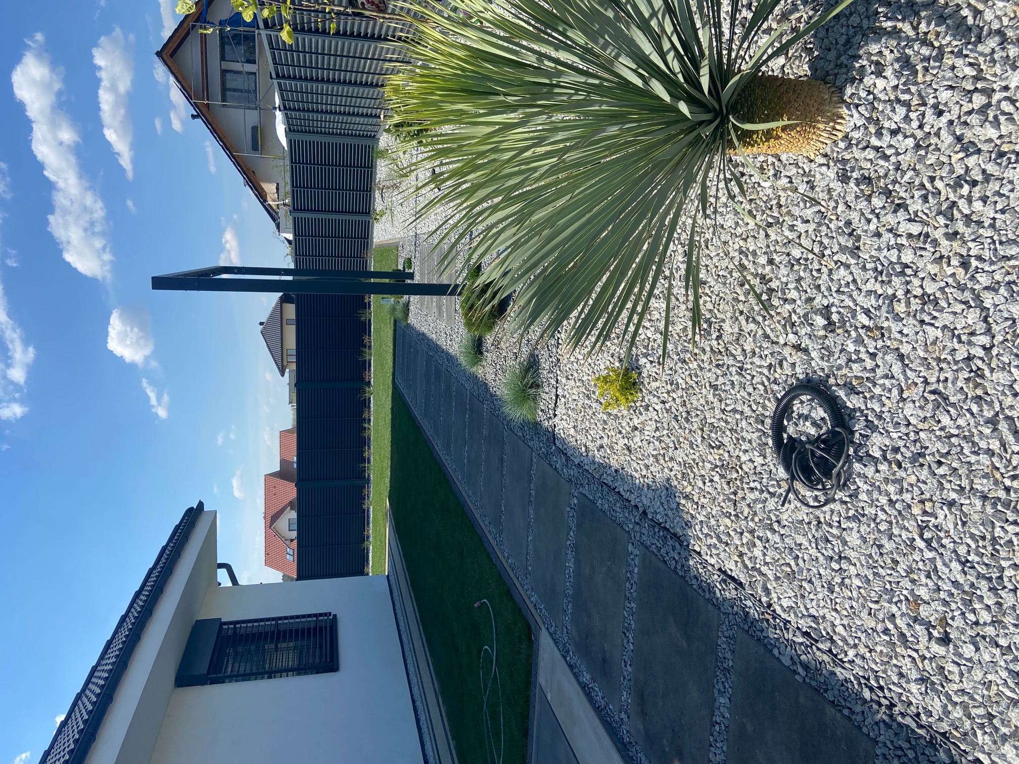 Zamontowana pergola stanowi praktyczny element małej architektury ogrodowej i doskonale wpisuje się w nowoczesne ogrody realizowane w Mierzynie i okolicach Szczecina.